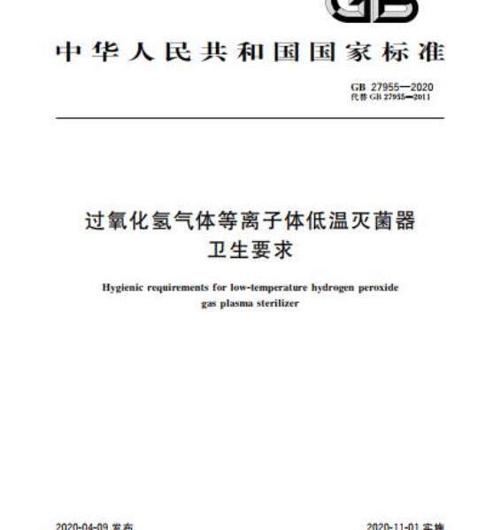 GB 27955适用于不耐湿、不耐高温的医疗器械、器具和物品灭菌的过氧化氢气体等离子体低温灭菌器。