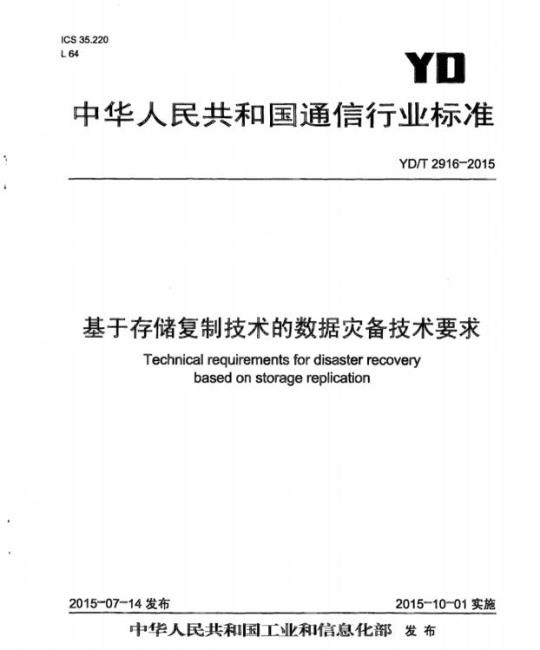 YD/T 2916规定了基于存储复制数据实现灾备的技术要求,包括数据复制模式与方法、数据完整一致性、传输安全与可靠性、通信性能与效率、备份与恢复操控管理、服务级别等。