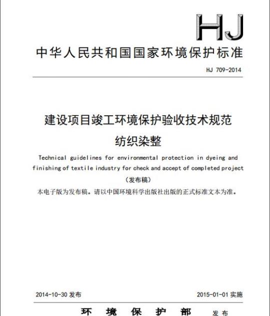 HJ 709规定了纺织染整建设项目竣工环境保护验收技术的工作程序、总体要求,验收技术方案和验收技术报告的编制要求。