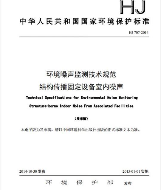 HJ 707规定了结构传播固定设备室内噪声监测的仪器、现场调查方法、监测方法、监测数据评价及质量保证和质量控制等的技术要求。