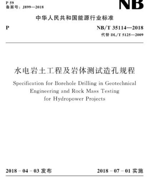 水电岩土工程及岩体测试造孔规程Specification for Borehole Drilling in Geotechnical Engineeringand Rock Mass Testing for Hydropower ProjectsNB/T35114—2018