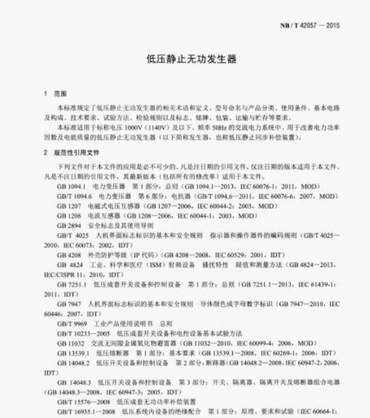 NB/T 42057适用于标称电压1000V (1140V)及以下、频率50Hz的交流电力系统中、用于改善电力功率因数及电能质量的低压静止无功发生器(以下简称发生器,也称低压静止同步补偿装置)。