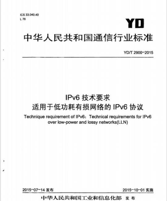 YD/T 2900-2015.Technique requirement of IPv6: Technical requirements for IPv6 over low-power and lossy networks(LLN).