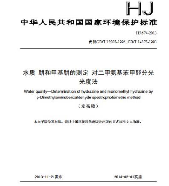 HJ 674-2013.Water quality-Determination of hydrazine and monomethyl hydrazine by p-Dimethylaminobenzaldehyde spectrophotometric method.