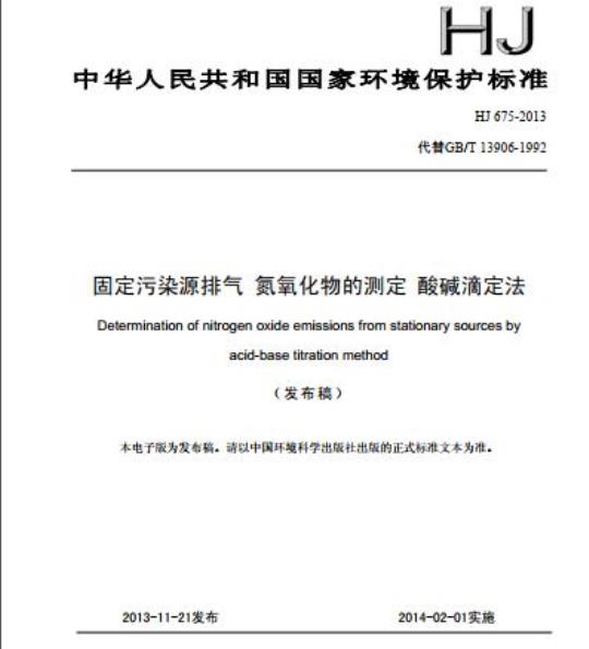 HJ 675规定了测定火炸药生产过程排出的硝烟尾气中氮氧化物的酸碱滴定法。