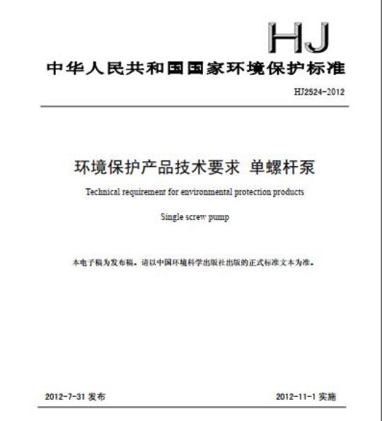 HJ 2524-2012.Technical requirement for environmental protection products Single screw pump.