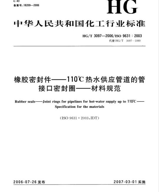 HG/T 3097规定了饮用和非饮用热水(达110C)供应管道用的硫化橡胶密封圈的材料要求。