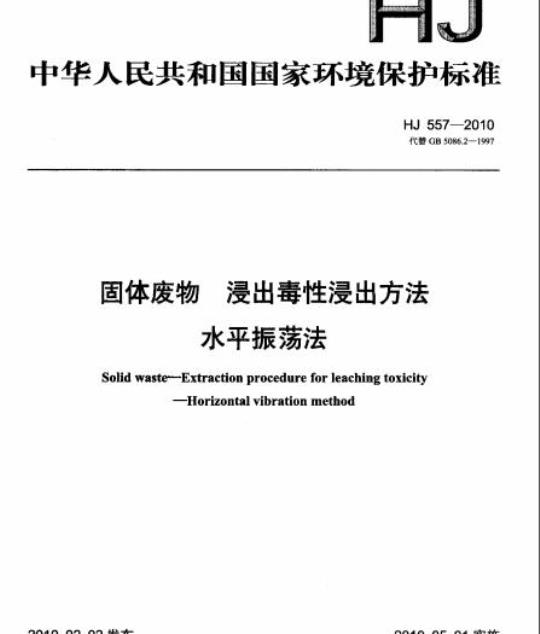 固体废物浸出毒性浸出方法水平振荡法(IIJ557—2010)该标摊自 2010 年:5月1日起实施,由中国环境科学出版社出版,标准内穿可在环境保护部网站(bz.mep.gov.cn)查询。