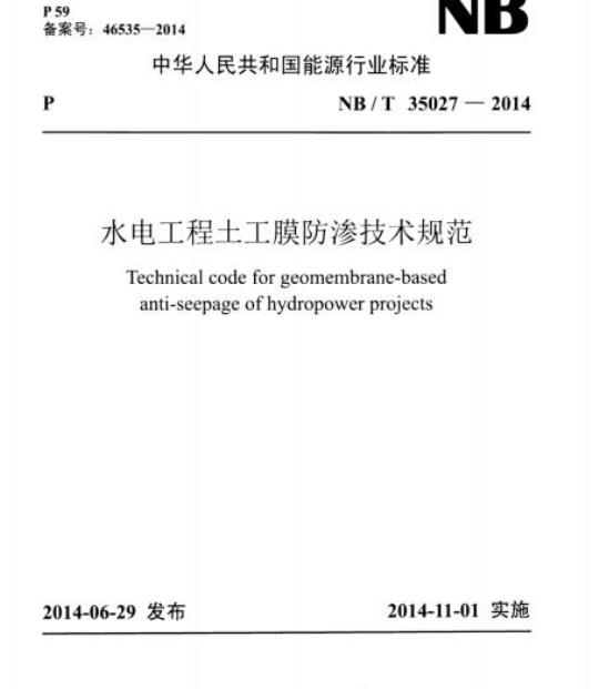 Technical code for geomembrane-basedanti-seepage of hydropower projectsNB/T35027—2014