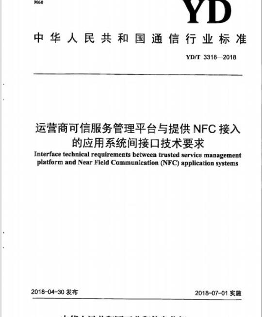 YD/T 3318规定了简单模式下运营商可信服务管理(TSM)平台与提供NFC接入的应用系统间接口技术要求,主要包括数据结构定义、TSM 平台应用接口定义、数据流程、异常处理要求等。