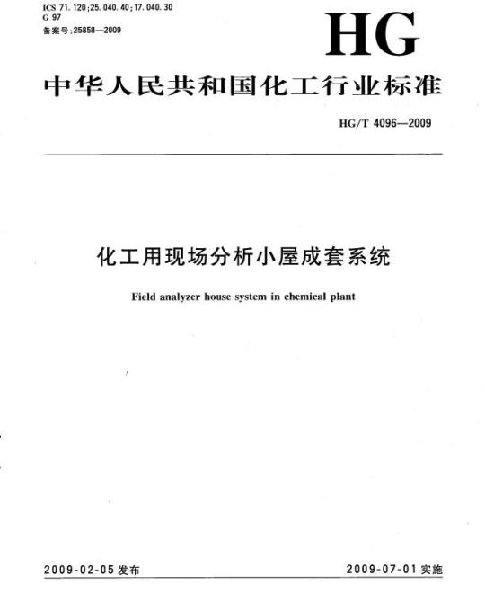 HG/T 4096规定了化工用现场分析小屋成套系统要求、试验和检验方法、检验规则及标志、包装、运输、贮存。