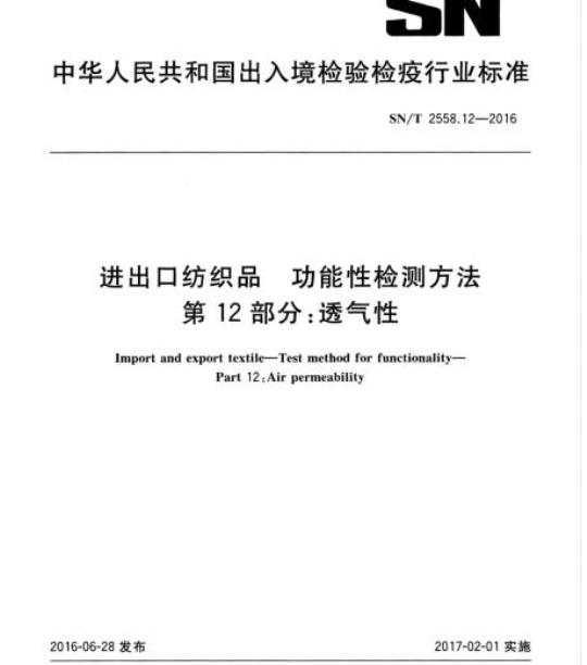 SN/T2558的本部分规定了进出口纺织品透气性能的检测方法。SN/T2558.12—2016
