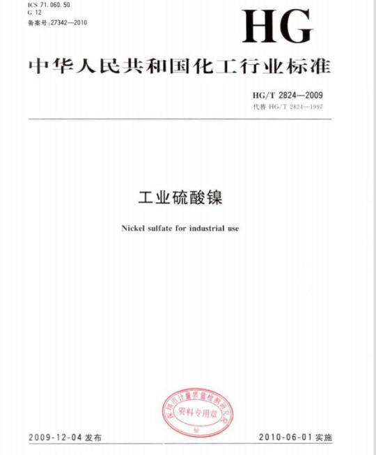 本标准代替HG/T2824-1997工业硫酸镍》。本标准与HG/T2824—1997相比主要技术差异如下:取消1类产品中合格品等级(1997年版的4.2,本版的5.2):HG/T2824-2009