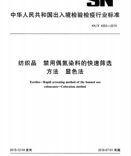 SN/T 4353规定了纺织产品中可分解出致癌芳香胺(参见附录A)的禁用偶氮染料的快速筛选方法。