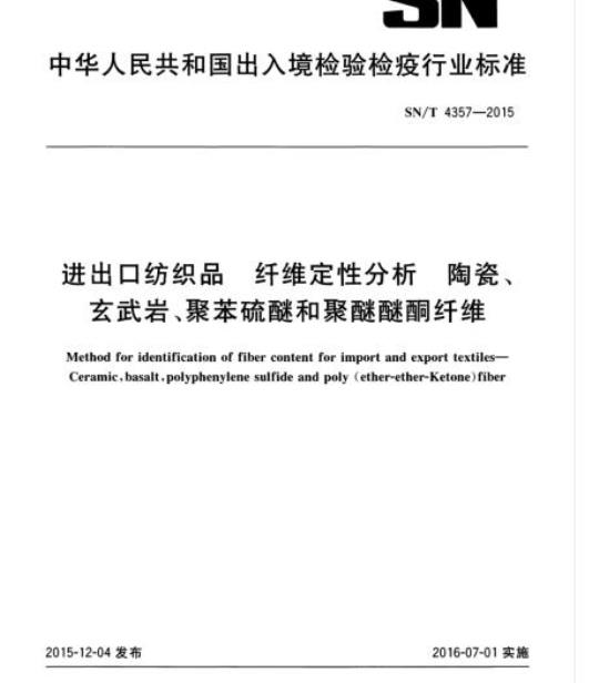 SN/T 4357规定了燃烧试验法、显微镜观察法、化学溶解法、红外光谱法.热分析法.密度法等六种用于陶瓷纤维、玄武岩纤维.聚苯硫醚纤维、聚醚醚酮纤维定性鉴别的试验方法。
