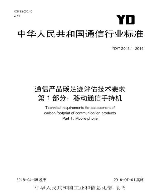 YD/T 3048.1规定了移动通信手持机碳足迹评估的原则、系统边界、计算方法、数据收集、数据质量要求、分配原则及数据发布原则。