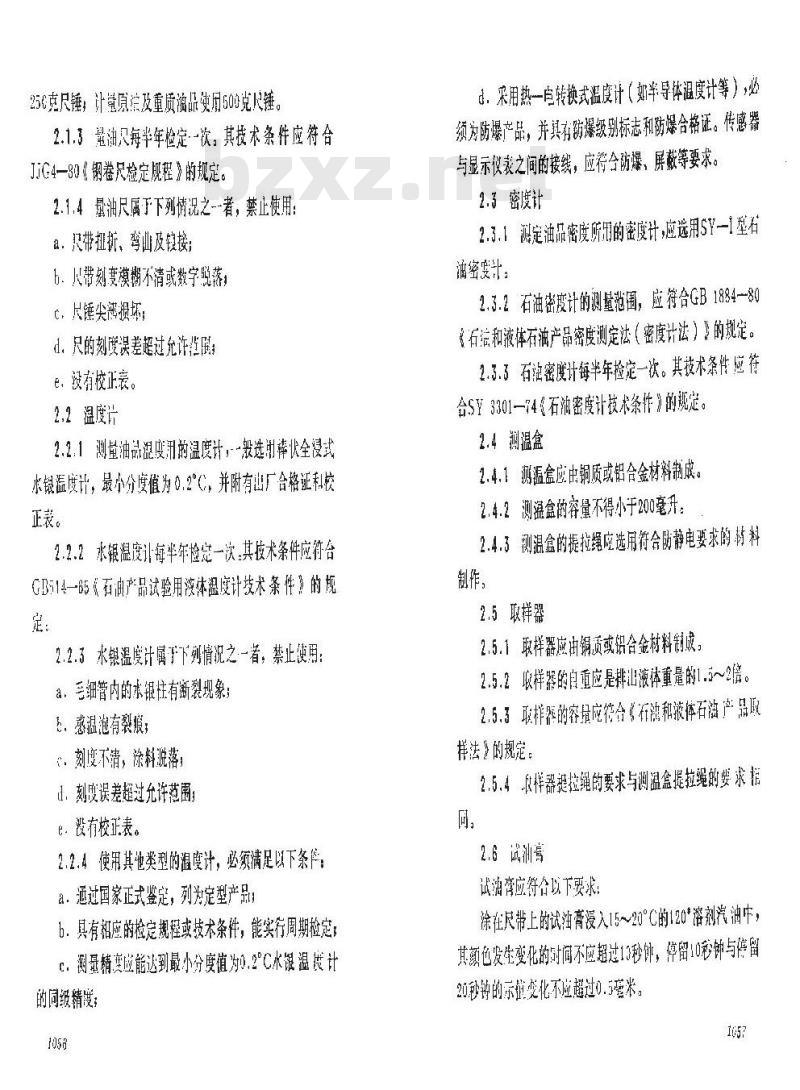 2.2.1谢量油品湿度用的温度计,一般选闭状全浸式水银溢度计,最小分度值为0.2°℃,并附有出厂合格证和核正表。