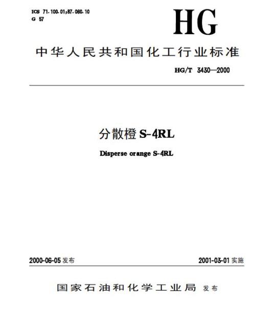 HG/T 3430规定了分散橙S-4RL(分散黄棕S-2RFL、C.I分散橙30)的要求、采样、试验方法、检验规则及标志、标签、包装、运输和贮存。