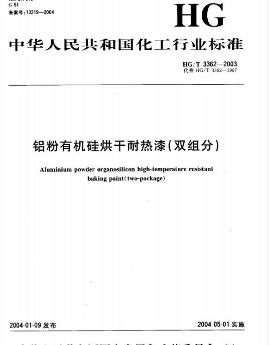 HG/T 3362适用于由清漆和铝粉组成,清漆是聚酯改性有机硅树脂的甲苯溶液,同时清漆与铝粉浆以10: 1均匀混合的铝粉有机硅烘千耐热漆(双组分)。该漆可以在150°C烘干,能耐500°C高温。主要用于涂覆高温设备的钢铁零件,如发动机外壳、烟囱、排气管烘箱、火炉等。