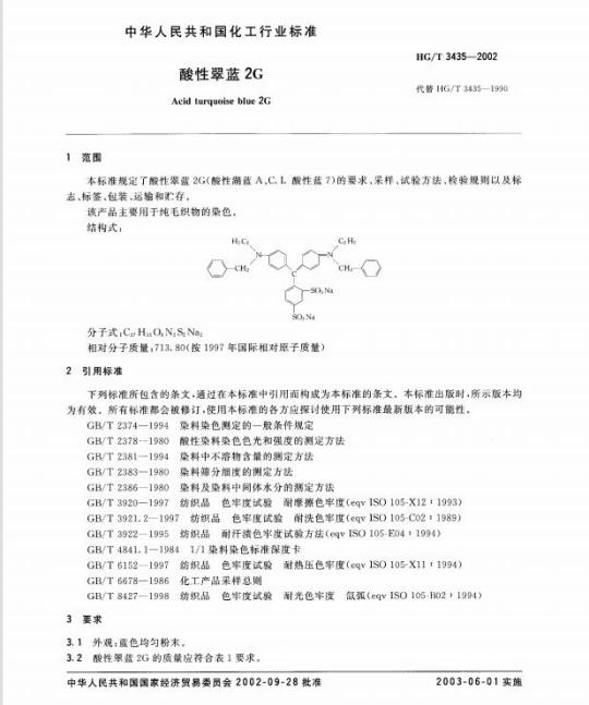 1990酸性举蓝2G(酸性潮蓝A)》修订而。本标推是对推荐性化T.行业标准HG/T3435标准与HG/T31351990的主要差异:对部分牢度指标进行了修订。