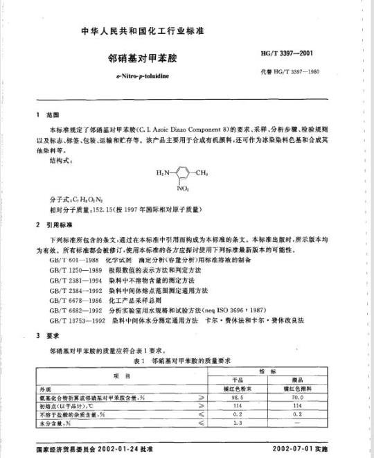 HG/T 3397规定了邻硝基对甲苯胺(C.I. Azoic Diazo Component 8)的要求、采样、分析步骤、检验规则以及标志、标签、包装、运输和贮存等。该产品主要用于合成有机颜料,还可作为冰染染料色基和合成其他染料等。