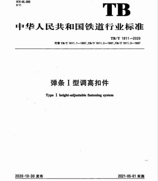 TB/T 1911规定了弹条I型调高扣件的组成、组装性能、零部件技术要求、检验方法、检验规则标志和包装以及储存和运输。