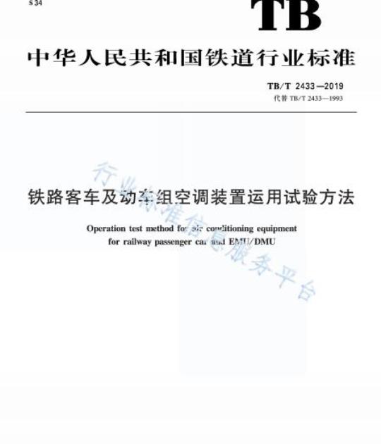 TB/T 2433适用于铁路客车(含高原客车带司机室的客车)和动车组空调装置装车后的测试,其他轨道车辆、司机室空调装置可参照使用。
