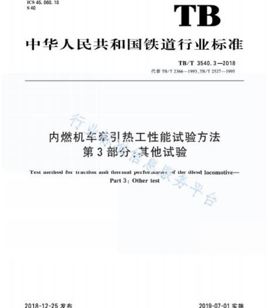 TB/T 3540.3规定了内燃机车牵引热工性能试验(其他试验)的试验项目、试验设备、试验要求、测量参数、试验方法。