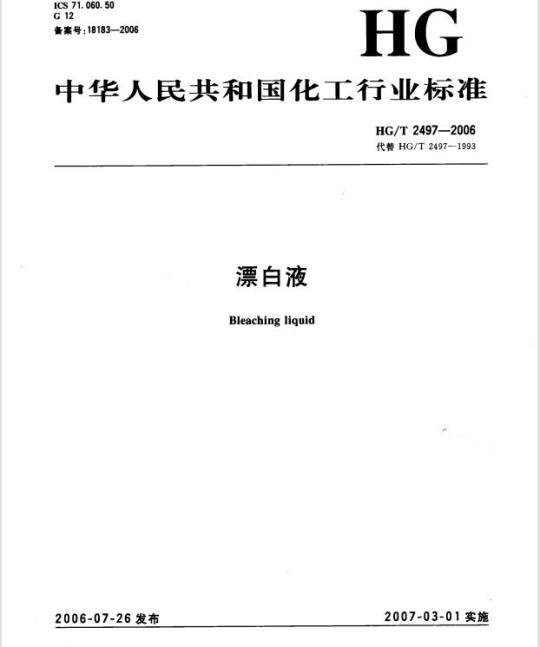 HG/T 2497适用于石灰乳或电石渣与氯气反应制得的漂白液。主要成分为次氯酸钙[Ca(CLO)2]。