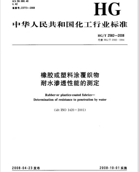 HG/T 2582-2008.Rubber-or plastics-coated fabrics-Determination of resistance to penetration by water.