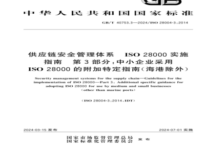供应链安全管理体系ISO28000实施指南(GB/T40753—2021);—第3部分:中小企业采用ISO28000的附加特定指南(海港除外)(GB/T40753.3一2024);—第4部分:以符合GB/T38702为管理目标实施ISO28000的附加特定指南(GB/T40753.42024)。
