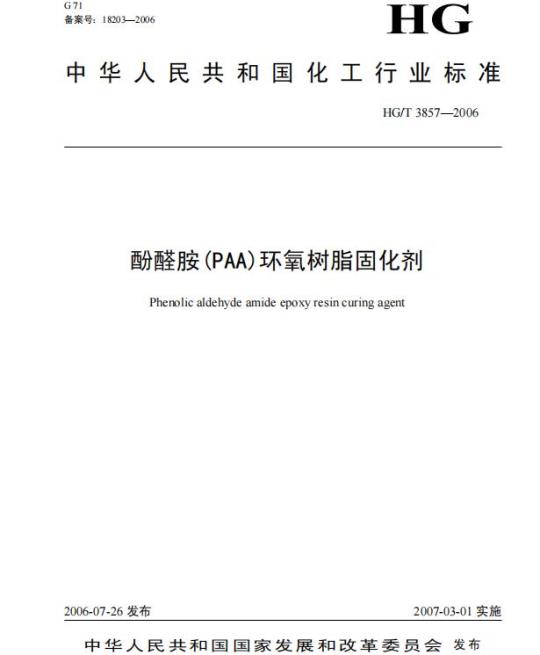 HG/T 3875适用于以多胺(脂肪胺、脂环胺和芳香胺)和酚、醛为主要原料经曼尼期( mannich)缩合反应合成的酚醛胺(PAA)环氧树脂固化剂。