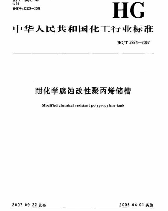 HG/T 3984适用于在温度为一10 C~80 C,常压下使用的,以改性聚丙烯层压板、挤出板为主要材料,采用塑料二次加工工艺制成的耐化学腐蚀储槽。