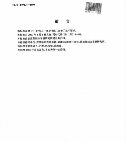 本标准是对TB1792.4—-86的修订,完善了技术要求。本标准自2000年6月1日实施,同时代替TB1792.4一86。本标准由铁道部四方车辆研究所提出并归口。TB/T1792.4-1999