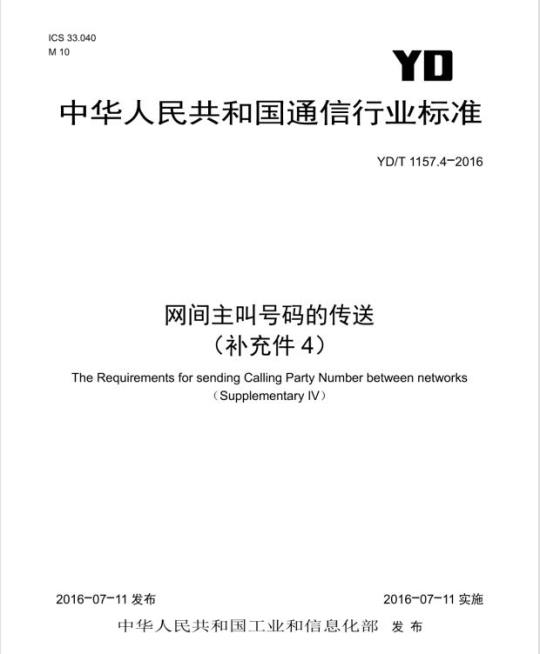 YD/T 1157.4-2016.The Requirements for sending Calling Party Number between networks (Supplementary IV).