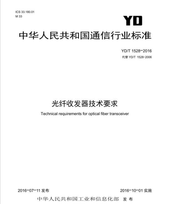 YD/T 1528-2016.Technical requirements for optical fiber transceiver.