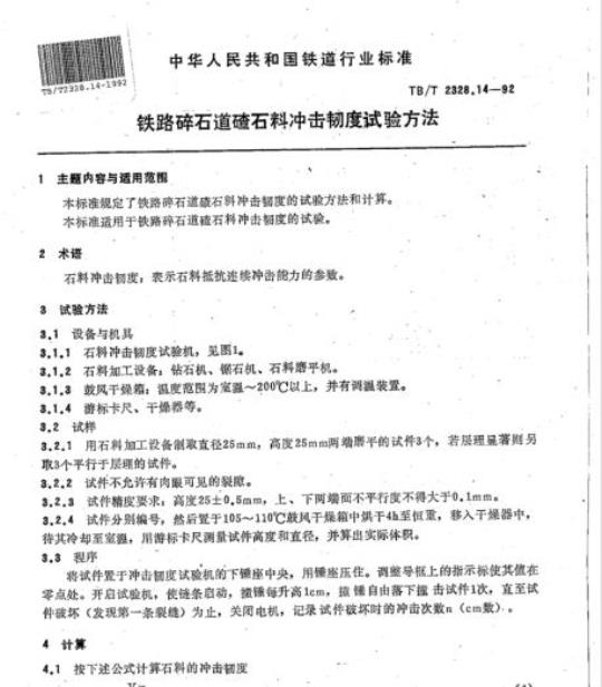 TB/T 2328.14规定了铁路碎石道碴石料冲击韧度的试验方法和计算。