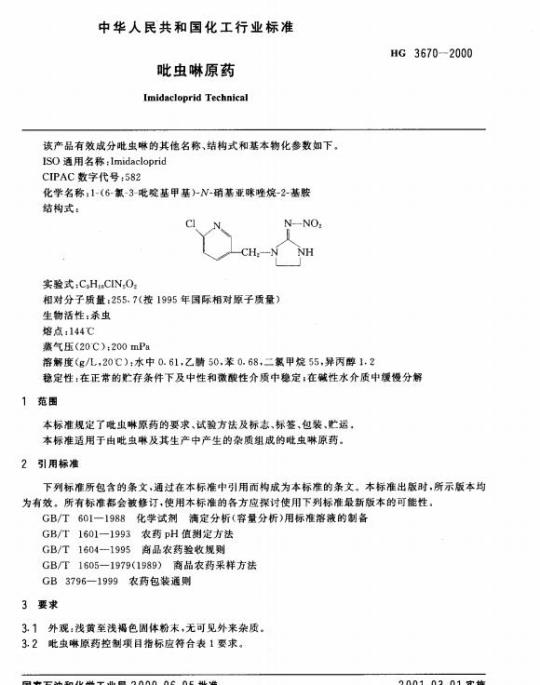 HG 3670规定了吡虫啉原药的要求、试验方法及标志、标签、包装、贮运。