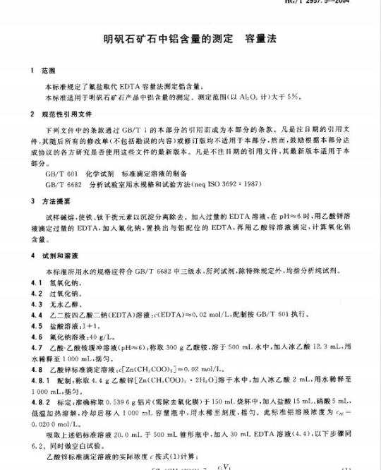 免费标准bzxz.net明矾石矿石中铝含量的测定容量法木标准规定了微盐取代EDTA等量法测定错含量HG/T 2957. 5-2004