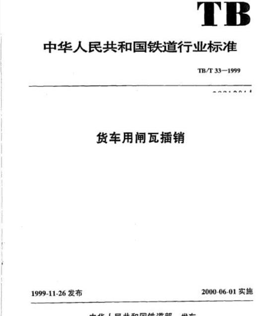 TB/T 33规定了货车甩闸瓦插销的型式与尺付技术要求和标记。