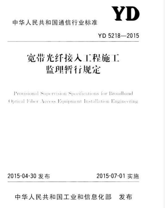 YD 5218-2015.Provisional Supervision Specifications for Broadband Optical Fiber Access Eqpuipment Installation Engincering.