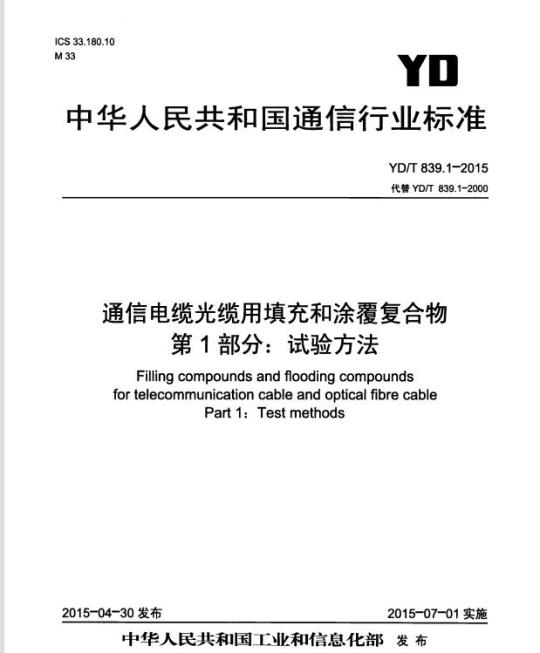 YD/T 839.1-2015.Filling compounds and flooding compounds for telecommunication cable and optical fibre cable Part 1: Test methods.