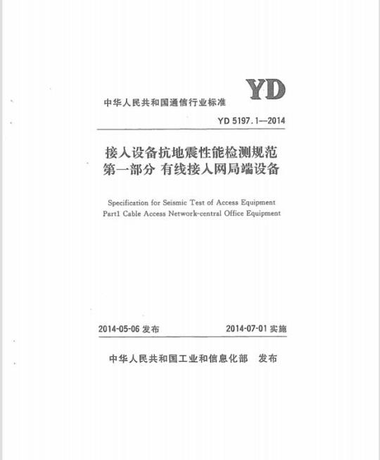 Specification for Seismic Test of Access EquipmentPartl.Cable Access Network-central Office EquipmentYD5197.1—2014