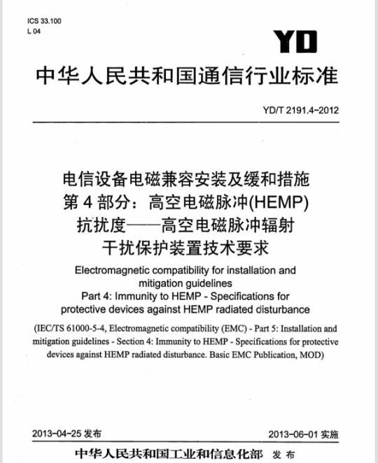 Part4:ImmunitytoHEMP-Specificationsforprotectivedevices against HEMP radiated disturbance(IEC/TS61000-5-4,Electromagnetic compatibility(EMC)-Part 5:Installation andmitigation guidelines - Section 4: Immunity to HEMP - Specifications for protectivedevices against HEMP radiated disturbance.Basic EMC Publication, MOD)2013-04-25发布