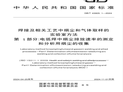 GB/T43905《焊接及相关工艺中烟尘和气体取样的实验室方法》对烟尘和气体的实验室取样和分析方法进行了规范化,有利于对不同工艺方法生成的烟尘和气体进行评估。GB/T43905是通用性基础方法标准,由六个部分构成。一第1部分:电弧焊中烟尘排放速率的测定和分析用烟尘的收集。目的在于规定适用于易生成烟尘的明弧焊焊接烟尘排放速率测定的实验室方法以及用于分析的收集方法。一第2部分:电弧焊、切割及气刨中一氧化碳、二氧化碳、一氧化氮、二氧化氮排放速率的测定。目的在于规定适用于电弧焊、切割及气刨过程中生成的一氧化碳、二氧化碳、一氧化氮、二氧化氮排放速率测定的实验室方法。一第3部分:电弧焊中臭氧排放速率的测定。目的在于规定适用于自动焊接电弧焊过程中臭氧排放速率测定的实验室方法。
