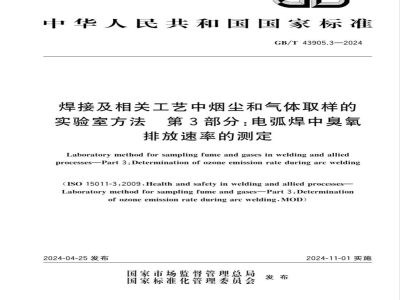 GB/T43905《焊接及相关工艺中烟尘和气体取样的实验室方法》对烟尘和气体的实验室取样和分析方法进行了规范化,有利于对不同工艺方法生成的烟尘和气体进行评估。GB/T43905是通用性基础方法标准,由六个部分构成。一第1部分:电弧焊中烟尘排放速率的测定和分析用烟尘的收集。目的在于规定适用于易生成烟尘的明弧焊焊接烟尘排放速率测定的实验室方法以及用于分析的收集方法。第2部分:电弧焊、切割及气刨中一氧化碳、二氧化碳、一氧化氮、二氧化氮排放速率的测定。目的在于规定适用于电弧焊、切割及气刨过程中生成的一氧化碳、二氧化碳、一氧化氮、二氧化氮排放速率测定的实验室方法。一一第3部分:电弧焊中臭氧排放速率的测定。目的在于规定适用于自动焊接电弧焊过程中臭氧排放速率测定的实验室方法。