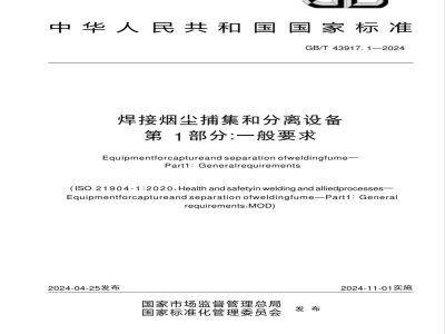 一第1部分:一般要求。旨在规定用于收集和分离焊接和相关工艺(如电弧焊和热切割)产生的烟气的通风设备总体的设计和制造要求。一第2部分:分离效率的测试和标记要求。旨在规定焊接烟尘分离设备分离效率的测试方法以及标记要求。