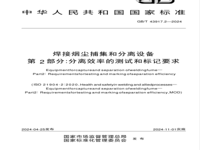 一第1部分:一般要求。旨在规定用于收集和分离焊接和相关工艺(如电弧焊和热切割)产生的烟气的通风设备总体的设计和制造要求。一第2部分:分离效率的测试和标记要求。旨在规定焊接烟尘分离设备分离效率的测试方法以及标记要求。