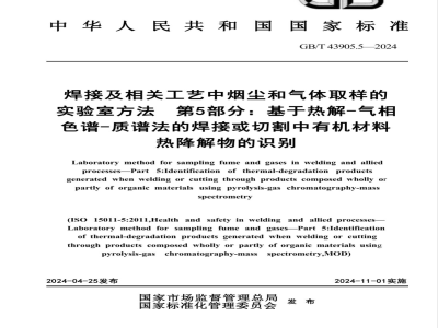-第4部分:焊接材料焊接烟尘排放限值。目的在于规定适用于非合金钢、合金钢和有色金属的手工、半自动或全自动电弧焊连接或堆焊所用的全部焊接材料焊接烟尘排放限值的编制方法。一一第5部分;基于热解-气相色谱-质谱法的焊接或切割中有机材料热降解物的识别。目的在于规定适用于全部或部分由有机材料组成的涂层在焊接、切割、预热和矫正过程中受热降解后生成的不明确产物组分识别和半定量化测量的实验室方法。一第6部分:电阻点焊中烟尘和气体的定量化测定。目的在于规定适用于有/无涂层钢板电阻点焊生成的烟尘和气体排放率测定的实验室方法。焊接及相关工艺生成烟尘和气体,如果吸入会对人体健康有害。有关烟尘和气体的成分、排放速率的资料能够帮助职业卫生专业人员评估工人的接触情况,进而确定适当的控制措施。GB/T43905.1和GB/T43905.2主要用于未涂覆涂层的金属焊接时生成排放速率数据。然而,焊接或切割全部或部分由有机材料组成的各种涂层是焊接行业的普遍现象,这些涂层包括车间底漆、油漆、油、蜡以及诸如胶黏剂和密封剂这类的焊缝间材料。当加热时,这些涂层会生成各种各样的热降解物,其成分取决于涂层经受的温度。在焊接和切割过程中,由于所加工材料内部存在温度分布,涂层材料经受的是一个温度范围。