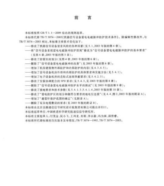 本标准按照GB/T1,1一2009给出的规则起草,本标难代替TB/T3074一2003《铁路信号设备雷电电磁脉冲防护技术条件》。除编辑性修改外,导TB/T3074—2003相比,本标准主要技术变化如下:修改了铁路信号设备宙害风险的各种因素(见5.1,2003年版的第4章)一将“信号设备系统雷电电磁脉冲防护原则\修改为“信号设备雷电电磁脉冲防护的基本要求”(见第4章,2003年版的第5章);修改了防雷区的划分(见第4章,2003年版的第6章):删除了*信号设备雷电电磁脉冲的改善\(见2003年版的第6章);增加了机房建筑物外部防护和内部防护的内容(见4.3、4.5);增加了信号设备机房外部和内部防护的具体要求和实施方法(见5.4.1):增加了电子设备机房的直贴式连续屏蔽要求(见5.4.2.3);修改了安装协调配合的SPD要求(见5.4.3,见2003年版的第8竞):删除了“信号设备雷电电磁脉冲防护水平的测试”(见2003年版的第9竞):修改了接地要求和技术参数(见5.4.1.3.5.4.1.4,2003年版的第10章);修改了“雷电防护区的划分利做符合要求的地电位连接”(见4.4、图2,2003年版的附录4);增加了“避雷针保护范围的确定”(见附录A);删除了有关电缆敷设的要求(见2003年版的附录B)。本标准由北京全路通信信号研究设计院集团有限公司提出并归口。本标准起草单位:中国铁道科学研究院通信信号研究所:本标雅主要起草人:付茂金、阮小飞、王州龙、肖桐、李永毅、冯为国、邱传睿。本标准所代替标准的历次版本发布情况:TB/T3074—1992、TB/T3074-—20031范围